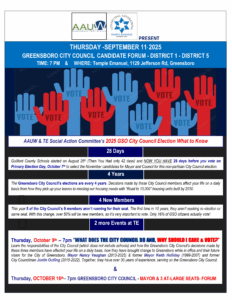 - Thursday, October 16th, flyer – GREENSBORO CITY COUNCIL MAYOR & AT-LARGE FORUM. Open to the public at Temple Emanuel, 1129 Jefferson Road, Greensboro.