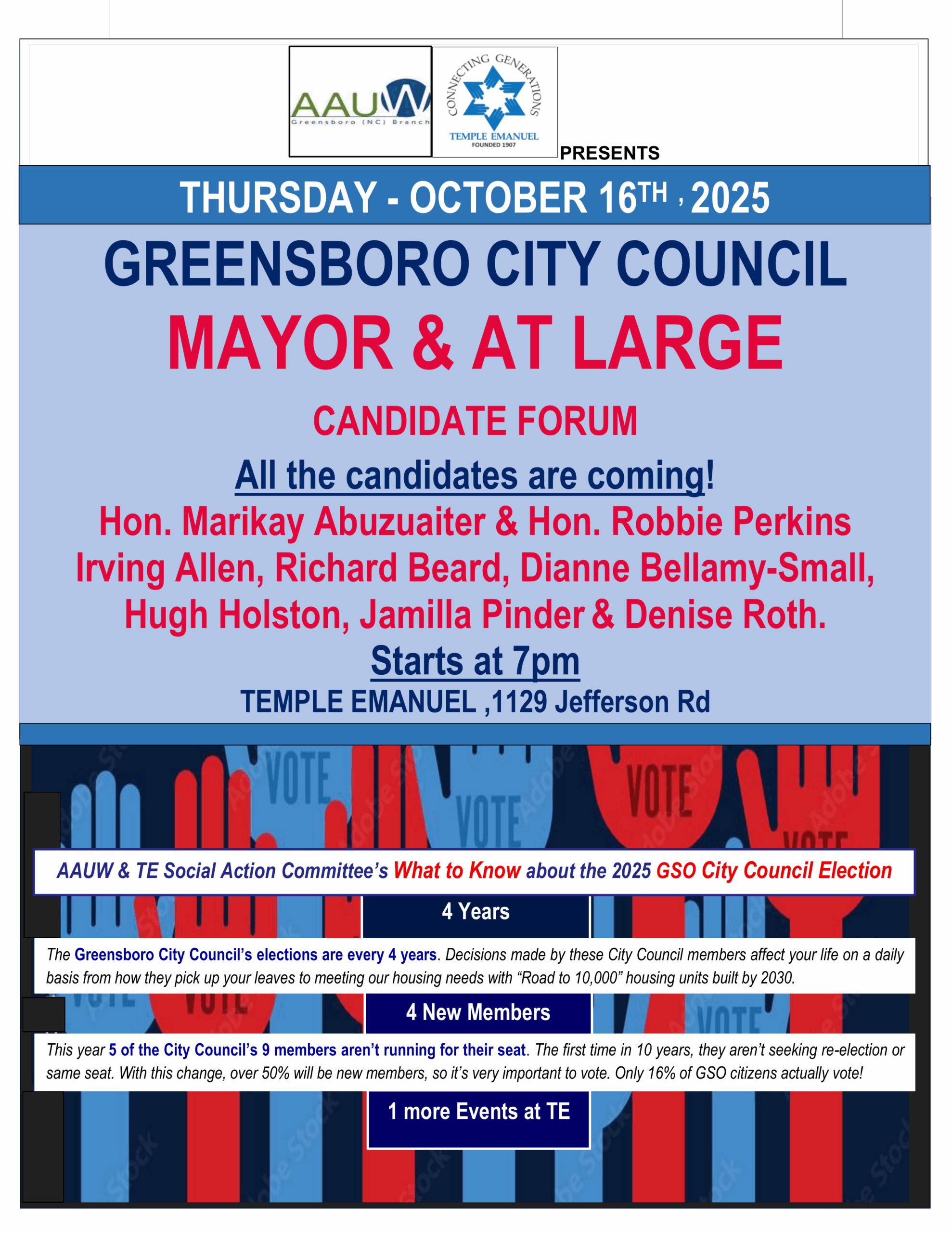 - Thursday, October 16th, flyer – GREENSBORO CITY COUNCIL MAYOR & AT-LARGE FORUM. Open to the public at Temple Emanuel, 1129 Jefferson Road, Greensboro.